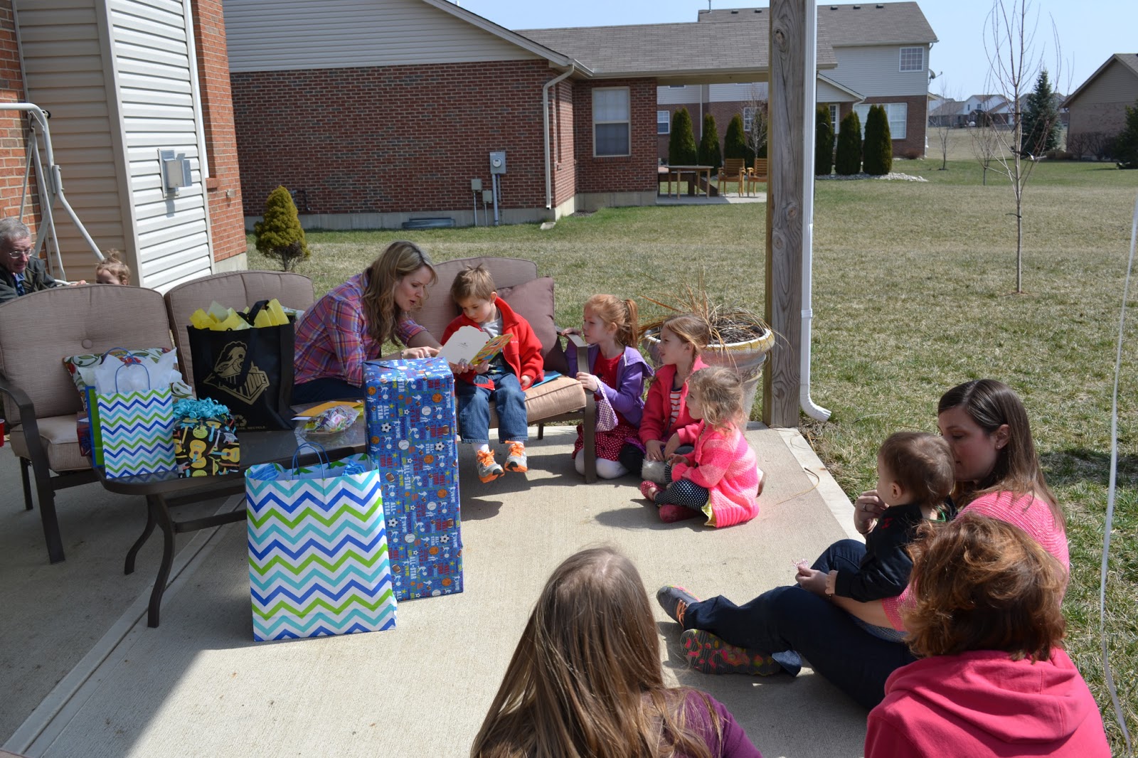 Opening gifts. Ella couldn't wait to give Cade what she picked out- Wreck It Ralph and Madagascar 3. He was thrilled!